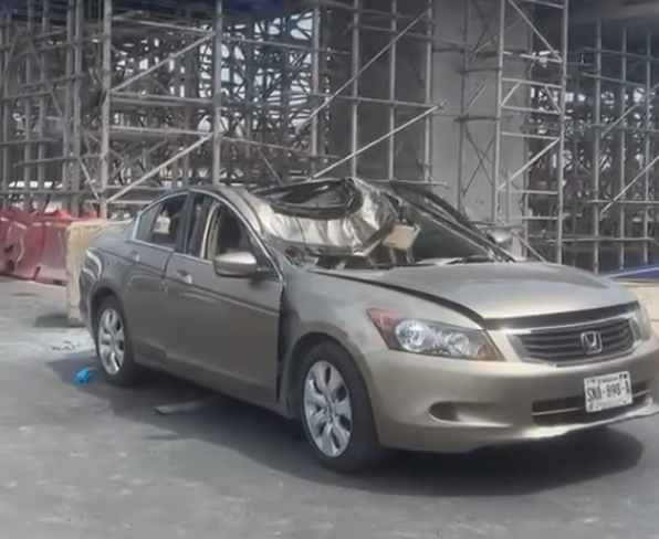 Un cubo de concreto usado como contrapeso en una grúa cayó sobre un vehículo en la avenida Miguel Alemán.