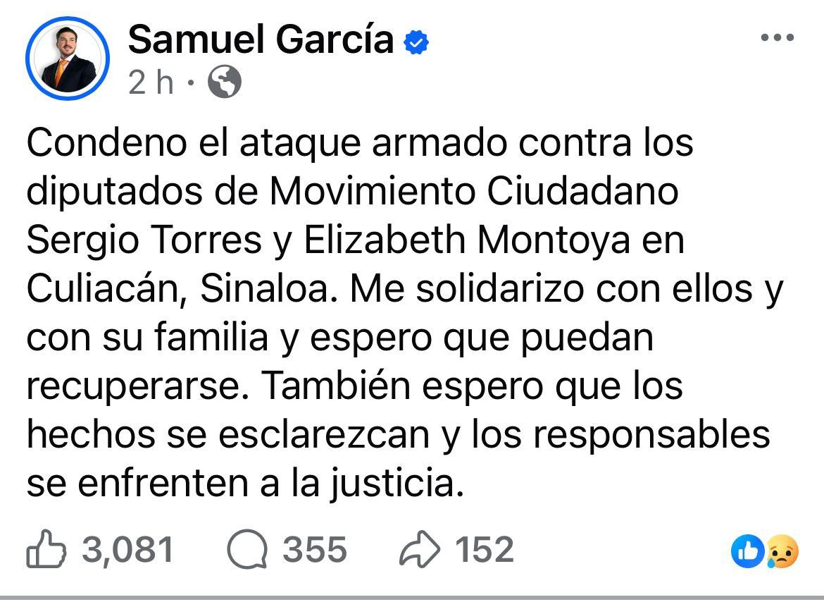 Tras el ataque a balazos contra los diputados locales de MC en Sinaloa, Sergio Torres Félix y Elizabeth Rafaela Montoya Ojeda, el Gobernador de Nuevo León, Samuel García, condenó los hechos y pidió castigar a los responsables.