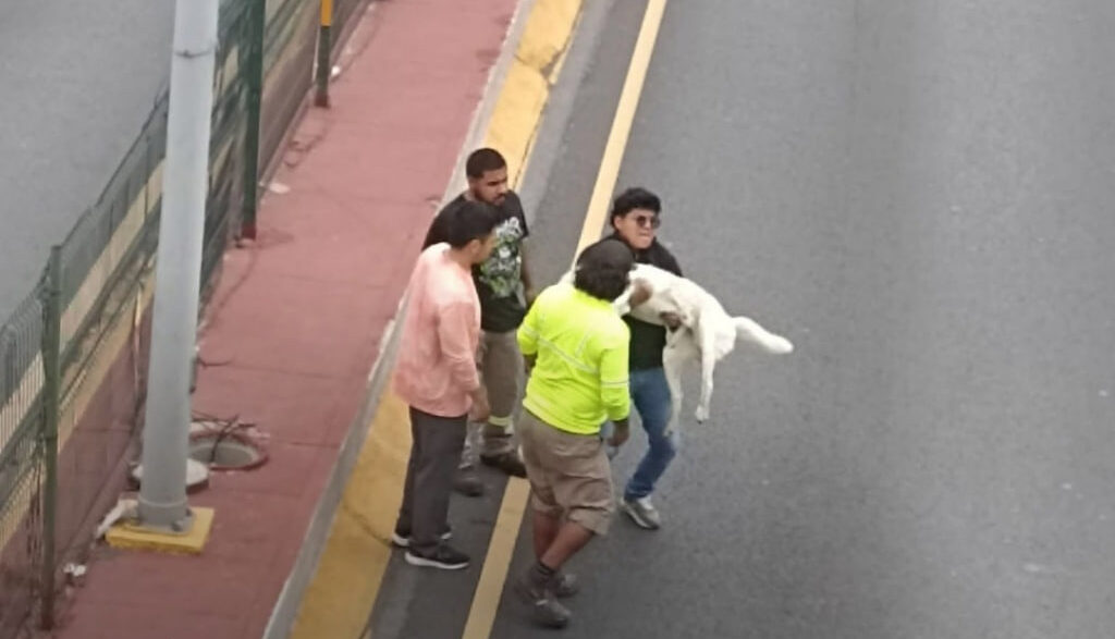 La escena, captada desde un puente peatonal y difundida en redes sociales, muestra el momento en que los jóvenes, sin dudarlo, se acercan al animal y lo ponen a salvo, exponiéndose ellos mismos al tránsito continuo de la zona.