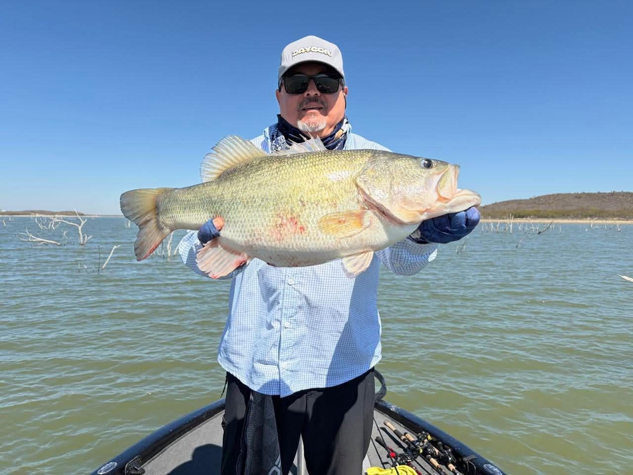 Imágenes compartidas en redes sociales muestran ejemplares de lobina negra de gran tamaño capturados recientemente en la presa El Cuchillo, en China, Nuevo León.